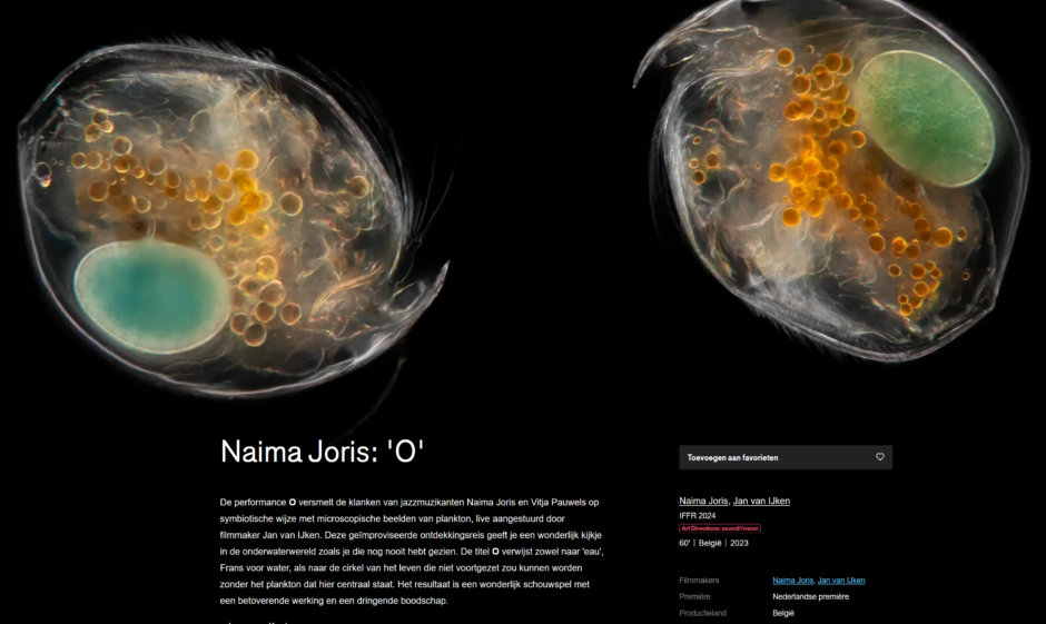 Naima Joris and Vitja Pauwels symbiotically merge their sound with Jan van IJken’s live edited microscopic images of plankton, to offer a glimpse into the underwater world as you’ve never seen it before. The title O is a reference to the circle of life of which plankton is an integral part, and a play on ‘eau’, the French word for water. The result is a thrilling improvised spectacle with an enchanting effect and an urgent message.