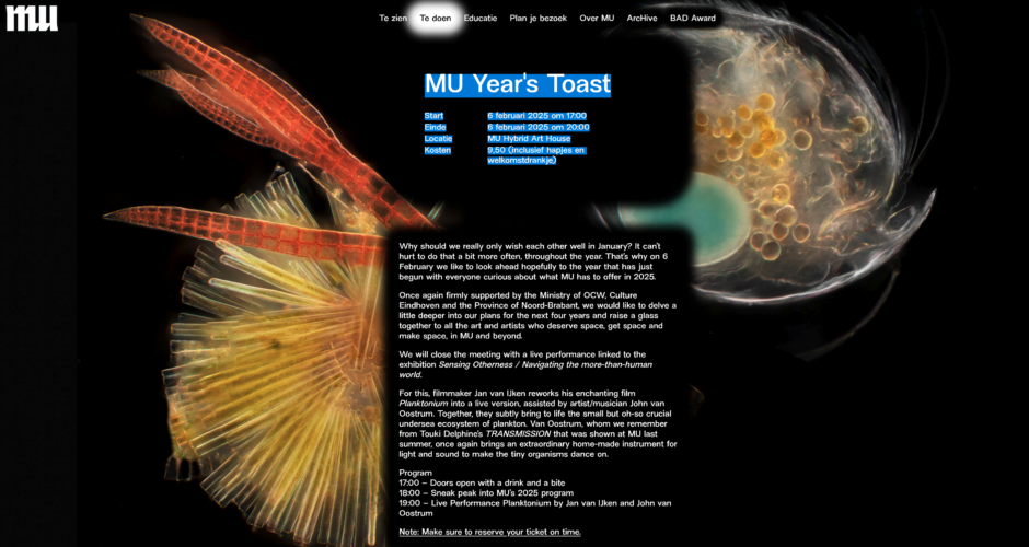 Program 17:00 – Doors open with a drink and a bite 18:00 – Sneak peak into MU’s 2025 program 19:00 – Live Performance Planktonium by Jan van IJken and John van Oostrum