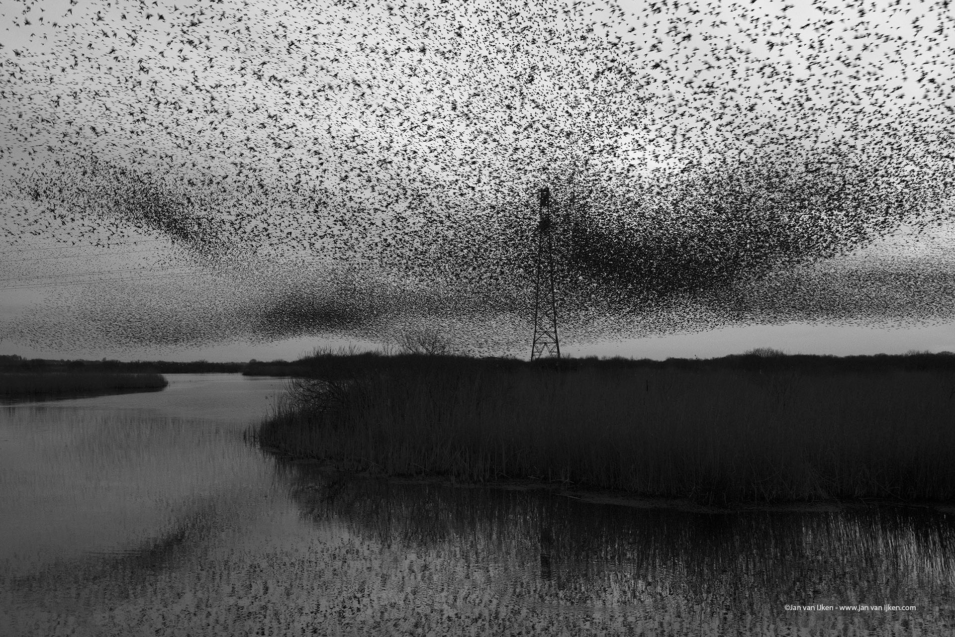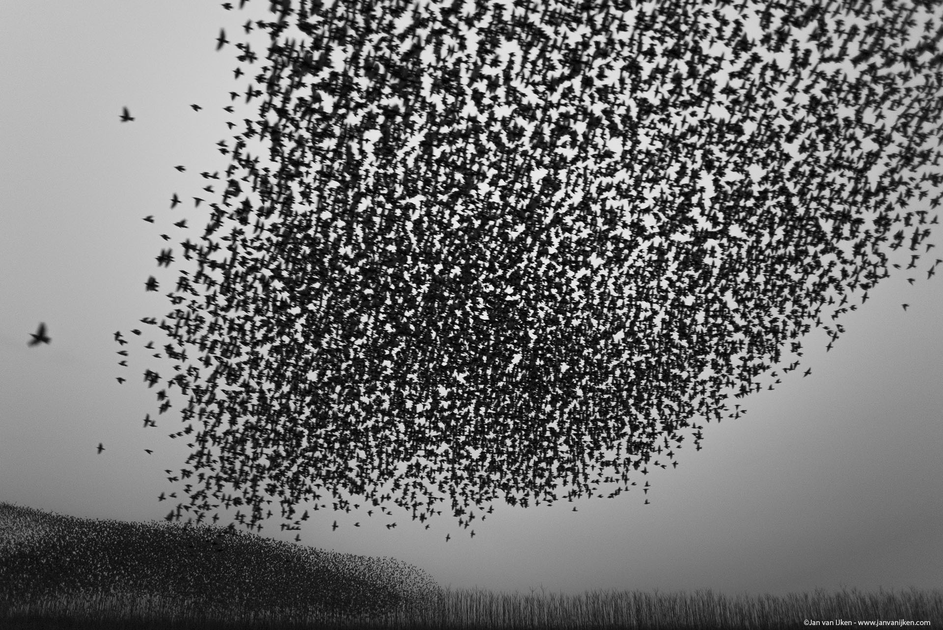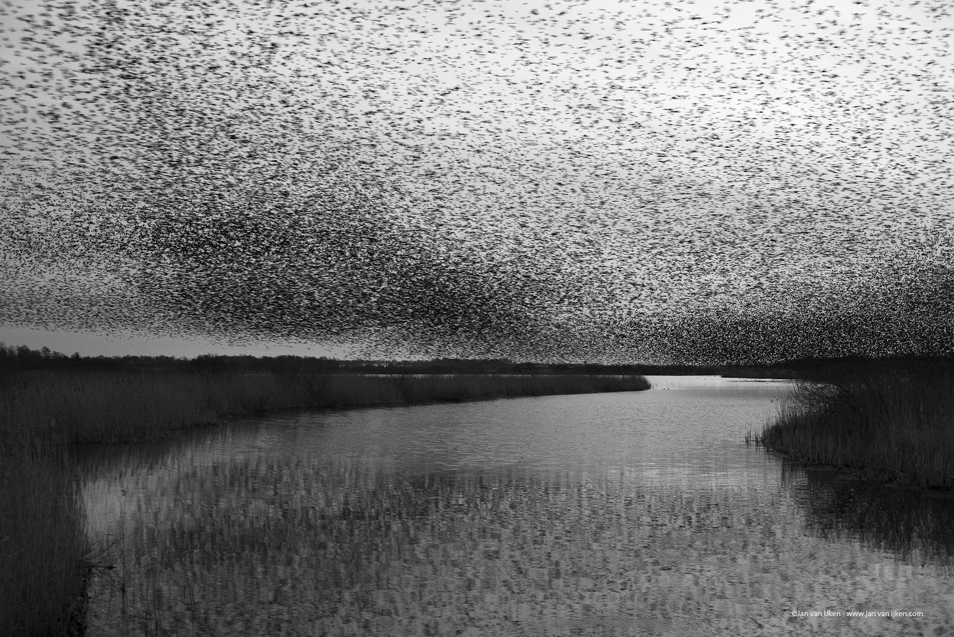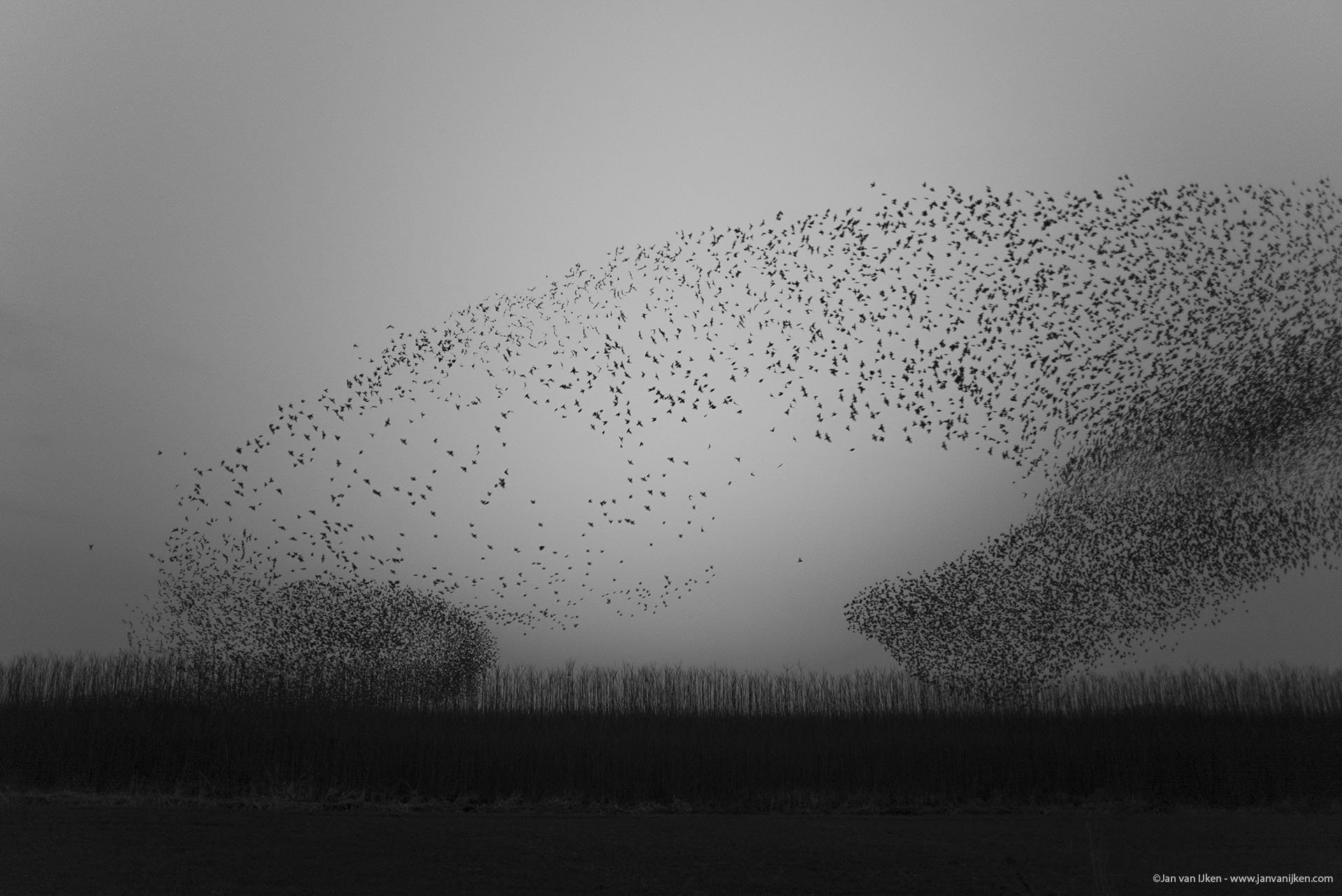 Short film and photo series about “murmurations”: the mysterious flights of the Common Starling. It is still unknown how the thousands of birds are able to fly in such dense swarms without colliding. Every night the starlings gather at dusk to perform their stunning air show. Because of the relatively warm winter of 2014/2015, the starlings stayed in the Netherlands instead of migrating southwards. This gave filmmaker Jan van IJken the opportunity to film one of the most spectacular and amazing natural phenomena on earth.