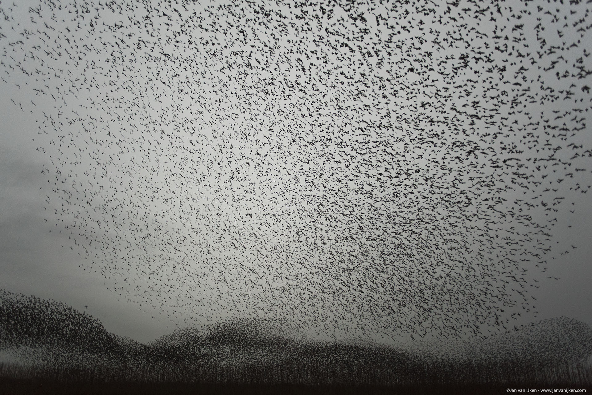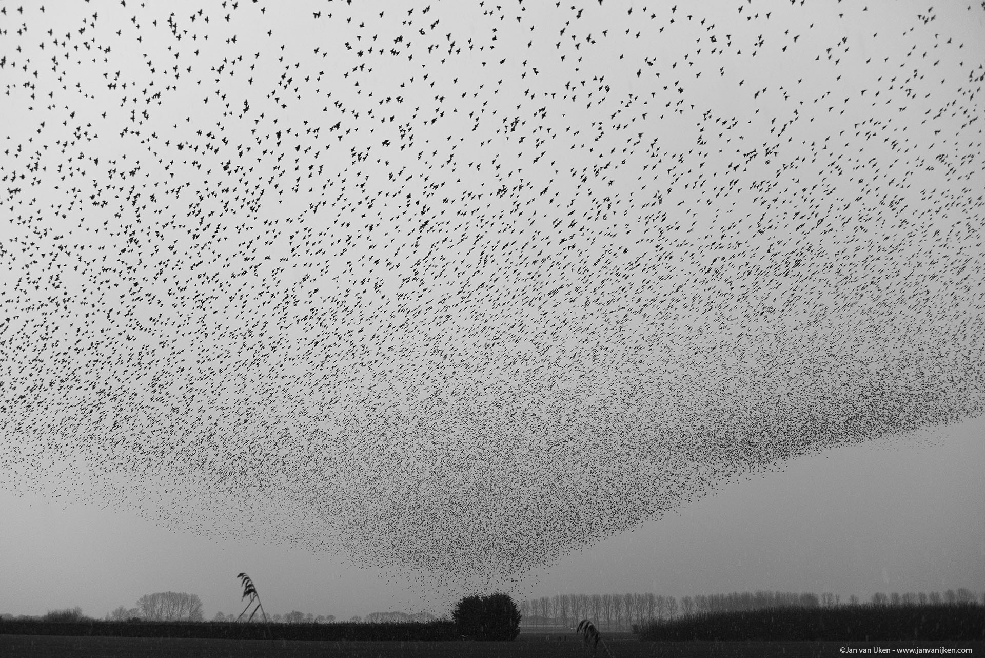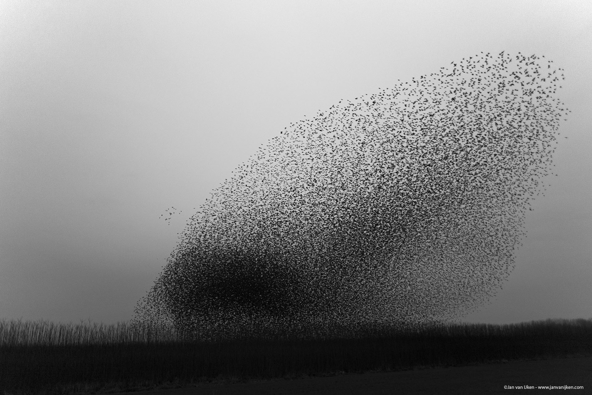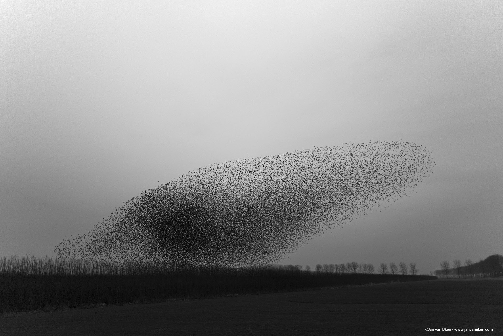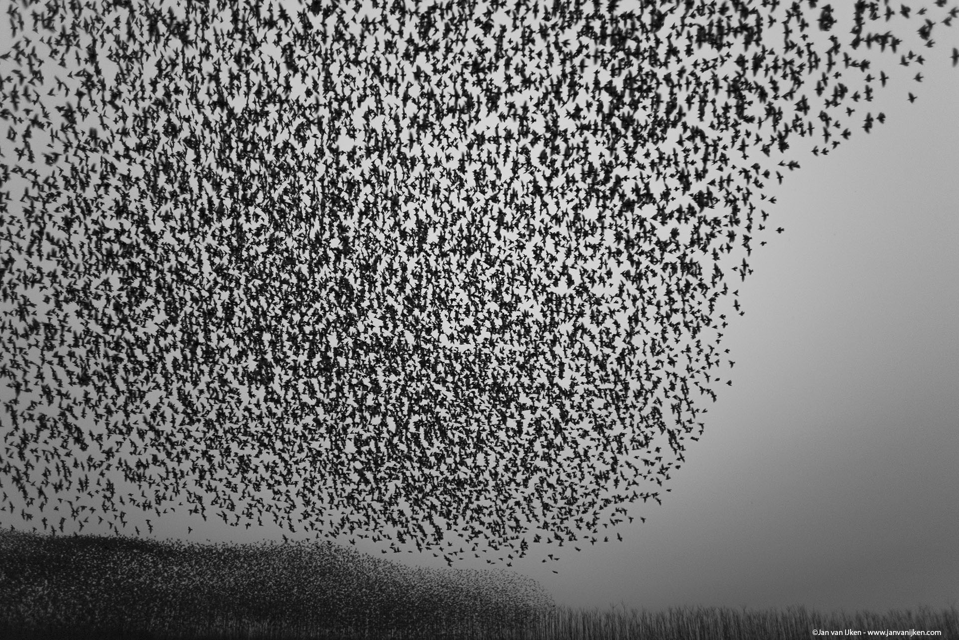 Short film and photo series about “murmurations”: the mysterious flights of the Common Starling. It is still unknown how the thousands of birds are able to fly in such dense swarms without colliding. Every night the starlings gather at dusk to perform their stunning air show. Because of the relatively warm winter of 2014/2015, the starlings stayed in the Netherlands instead of migrating southwards. This gave filmmaker Jan van IJken the opportunity to film one of the most spectacular and amazing natural phenomena on earth.